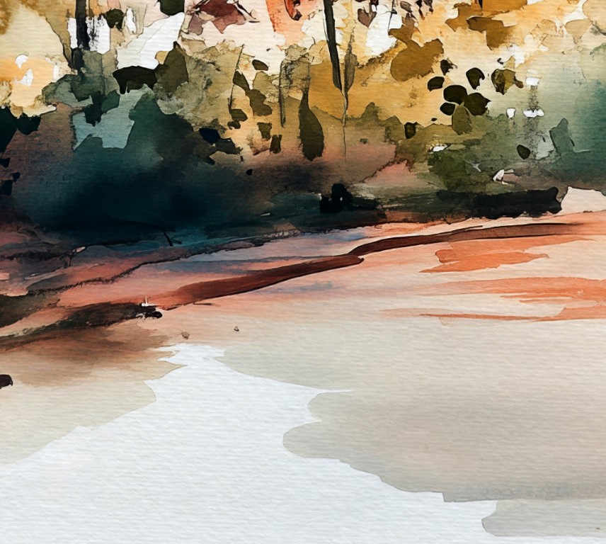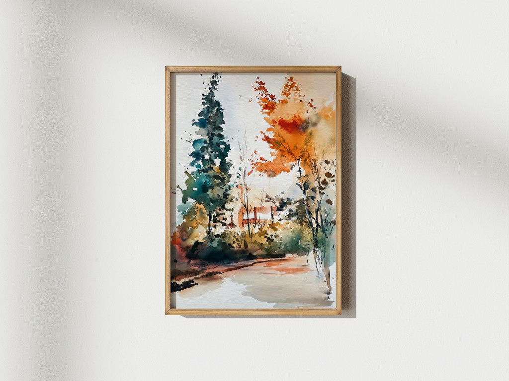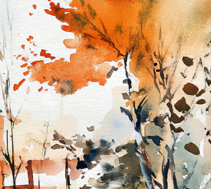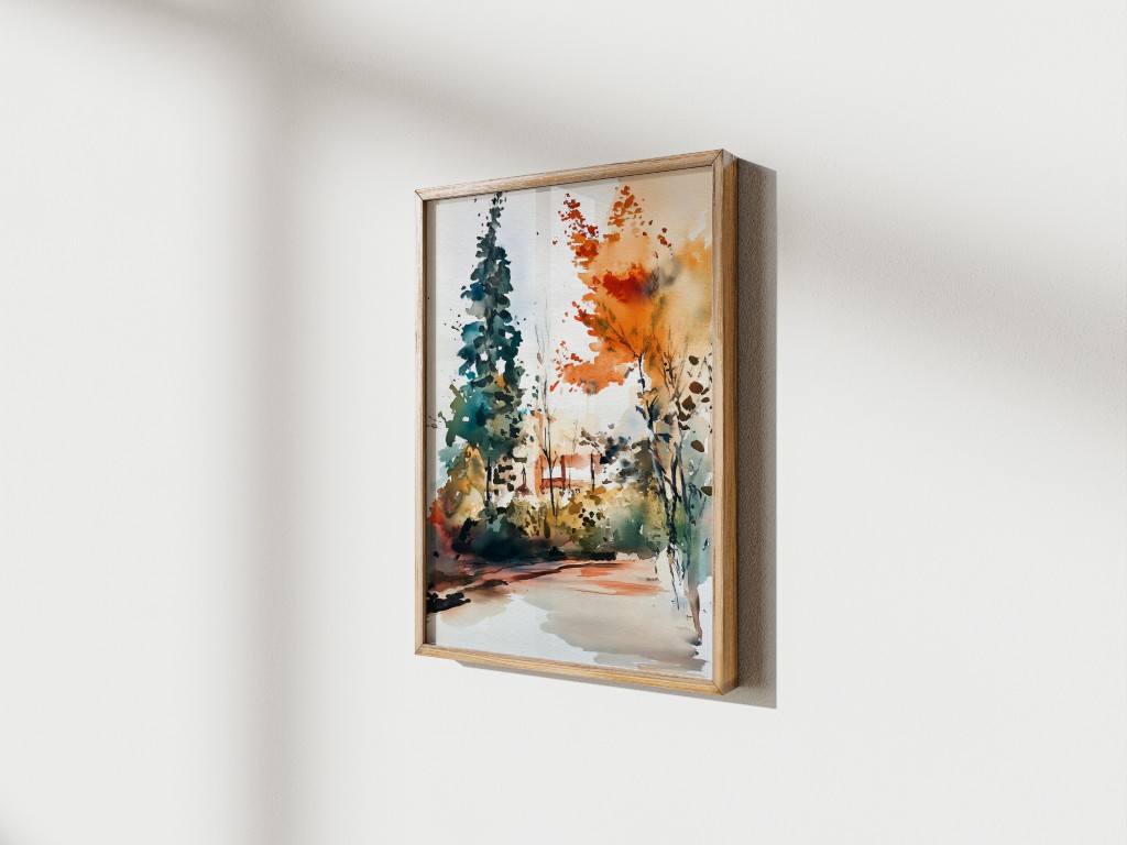 A serene autumn watercolor scene featuring vibrant orange and green foliage. Soft brushstrokes bring seasonal charm to life.