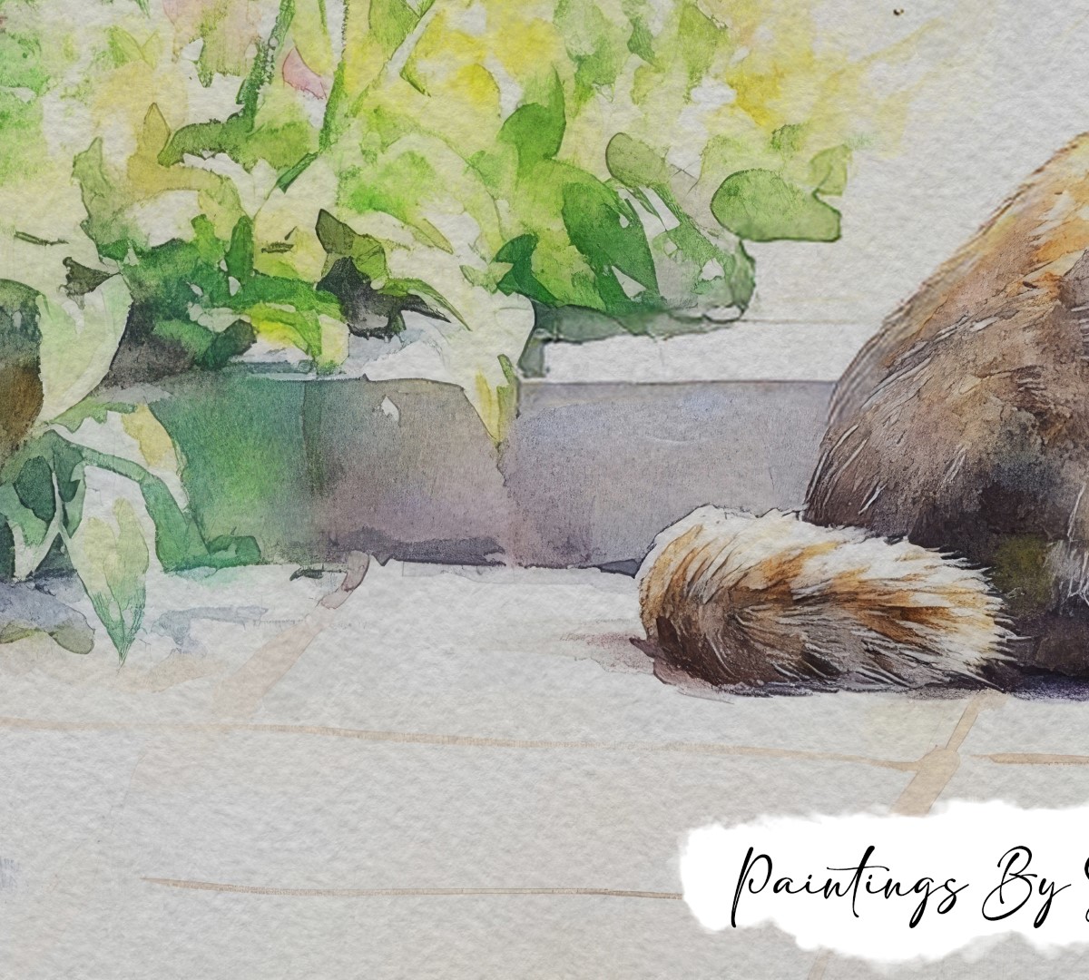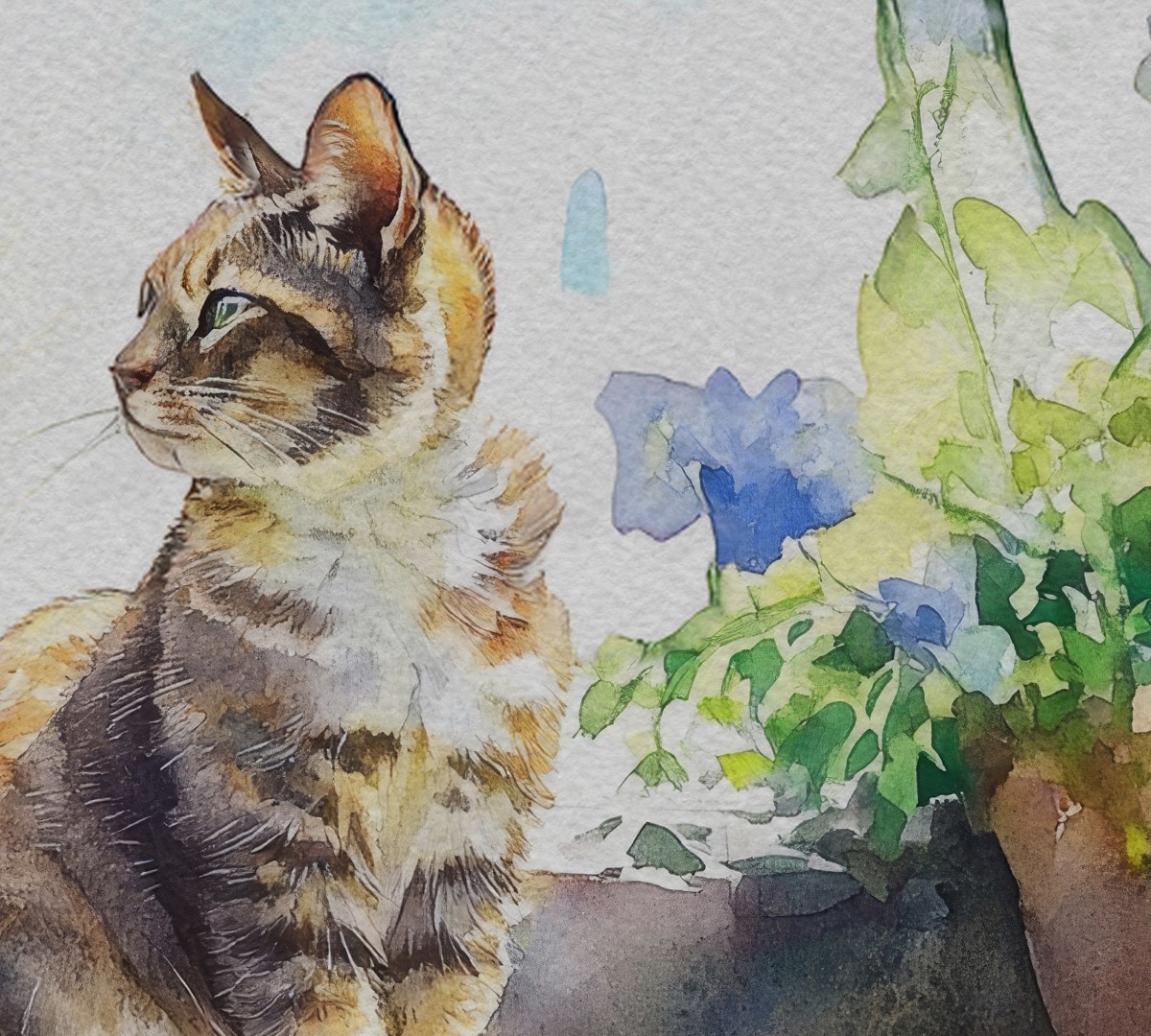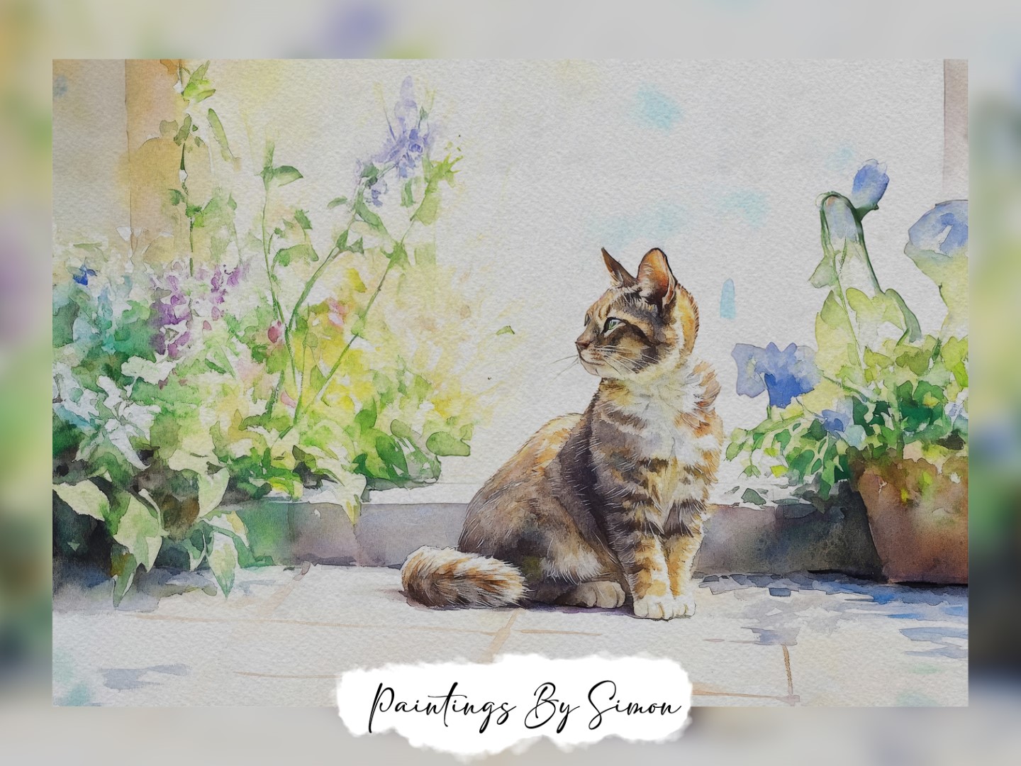 This serene matte print, titled Cat in Garden, captures the quiet charm of a cat enjoying the peace of a lush garden. The watercolor painting beautifully illustrates the cat’s soft, striped fur and curious gaze as it sits amid vibrant green foliage and delicate flowers. Additionally, soft pastels and earthy tones in the background create a peaceful ambiance, making the scene feel like a gentle, sunlit morning.