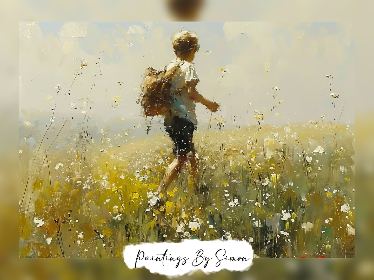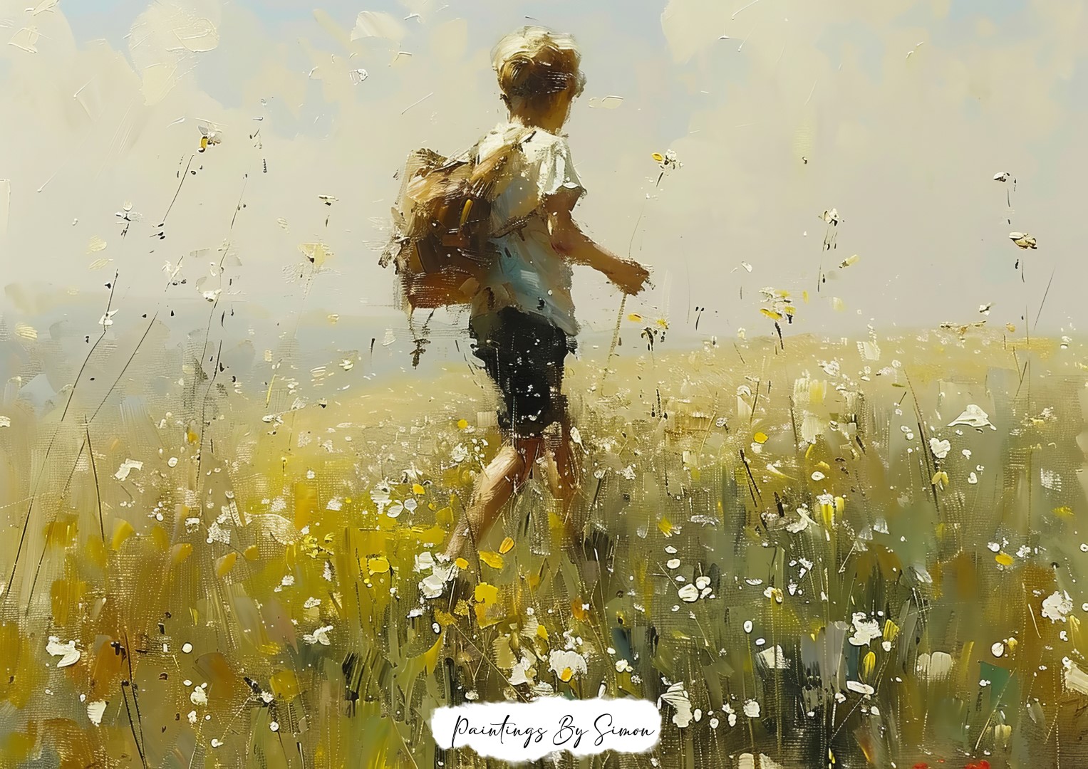 This serene painting captures a peaceful moment of a child wandering through a sunlit flower field. Soft, impressionistic brushstrokes give the scene a dreamlike quality. Golden tones and delicate wildflowers sway gently in the breeze, adding to the tranquil mood. The child, dressed casually with a backpack, appears to explore the field in quiet reflection, taking in the beauty of nature.