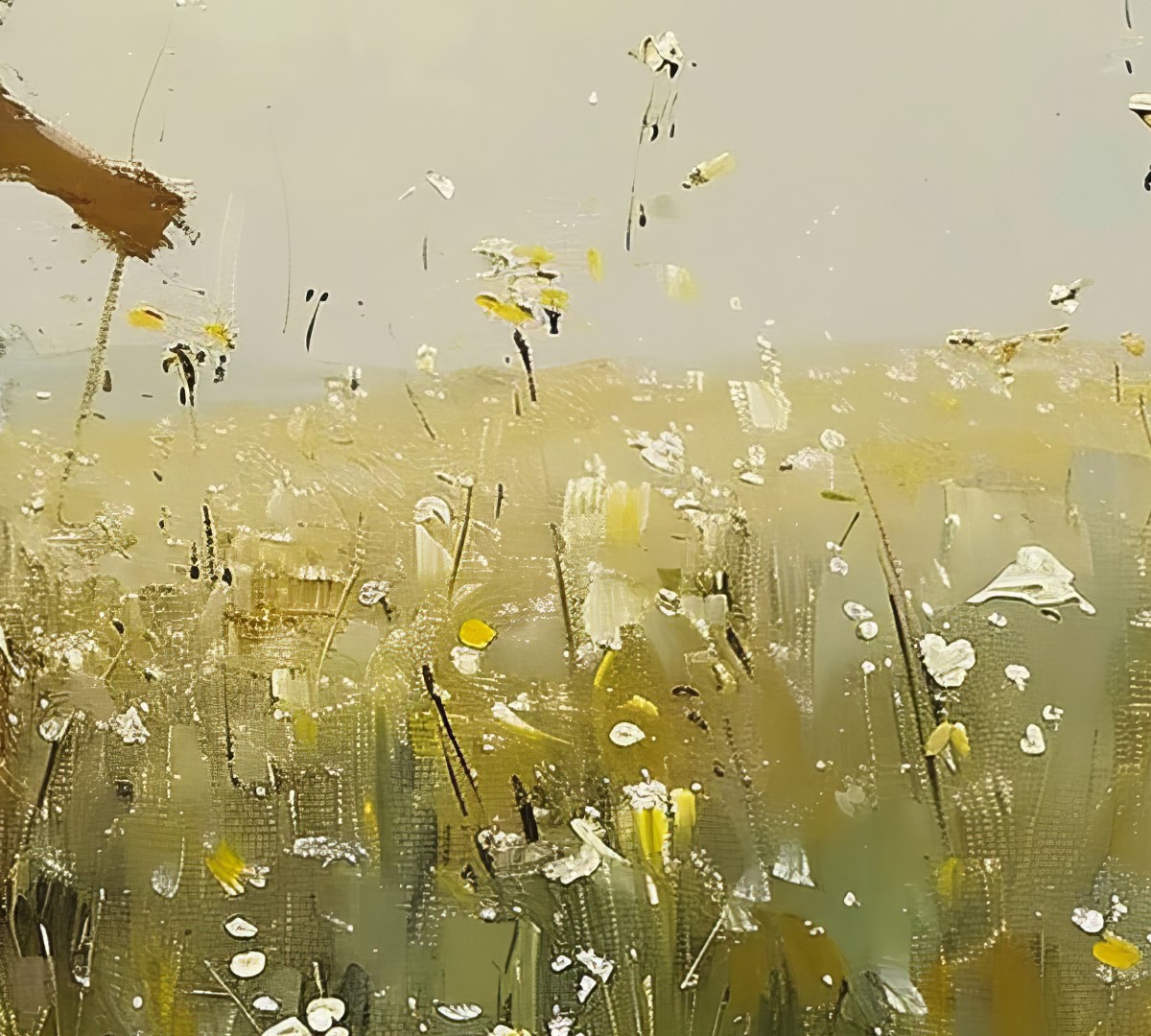 Moreover, the light in this painting is particularly striking. It filters softly through the flowers, creating a warm, glowing atmosphere. Additionally, the tall wildflowers and grasses add texture and depth to the scene. The background fades gently into the distance, suggesting a boundless expanse of natural beauty. The subtle colors, from pale yellows to soft greens and whites, enhance the overall tranquility.