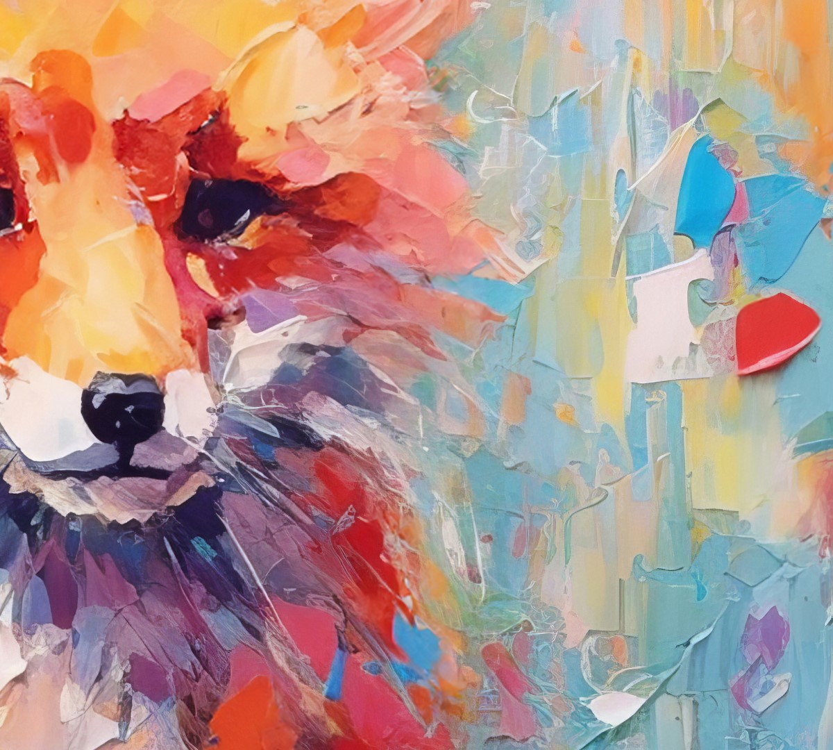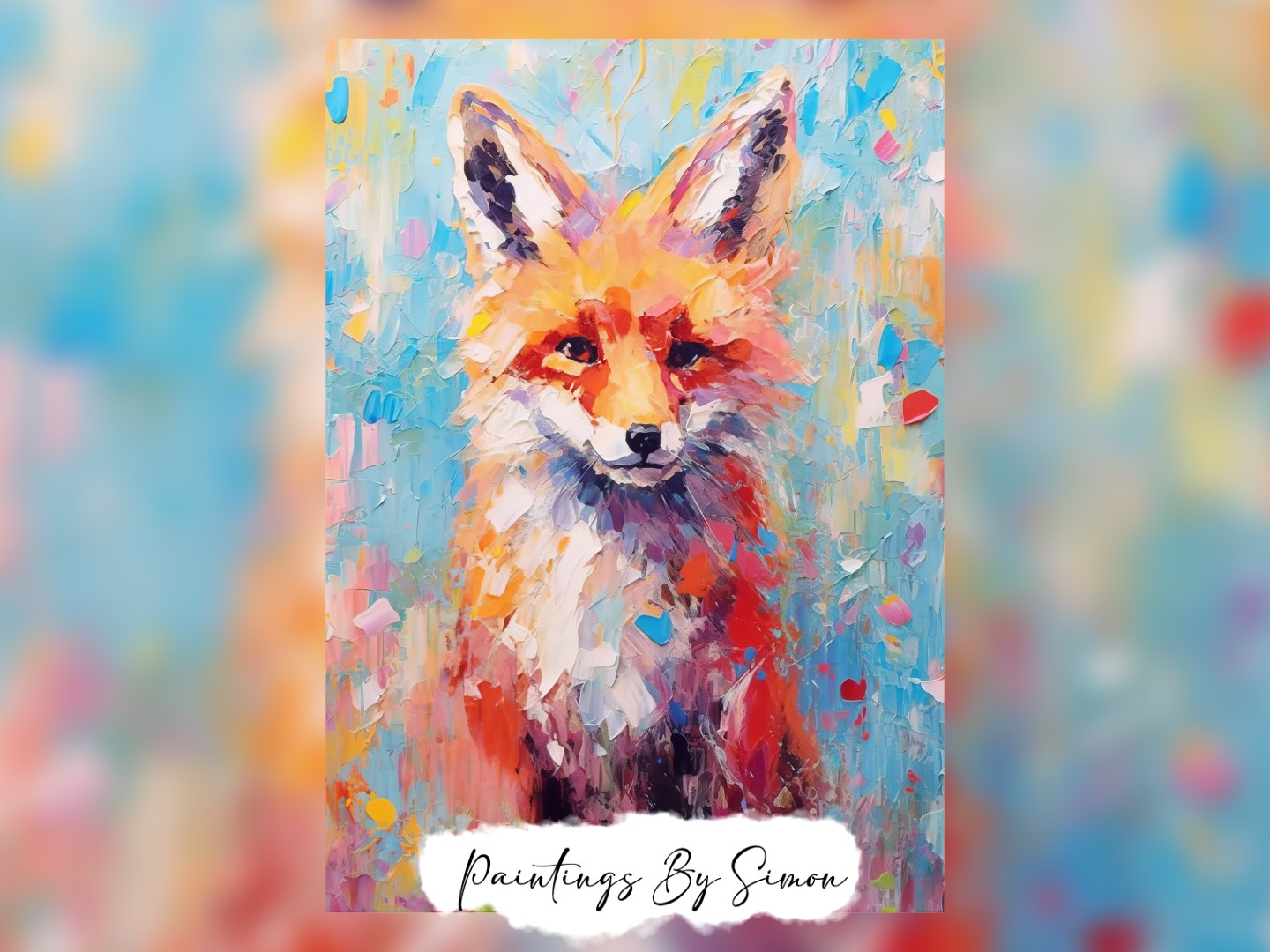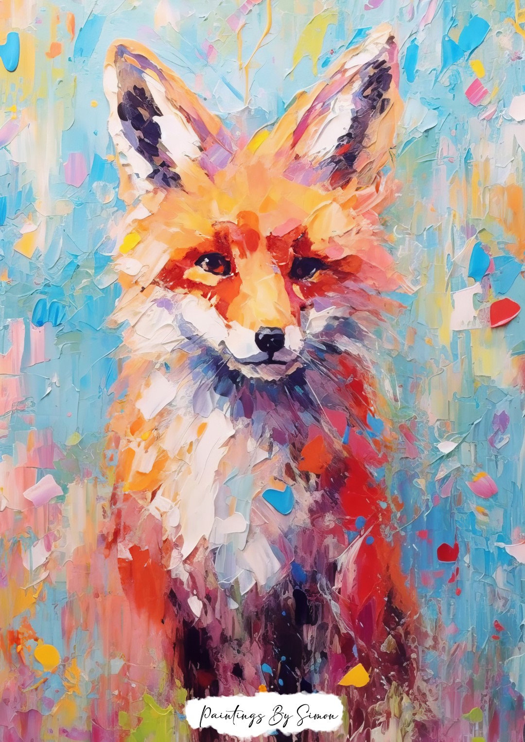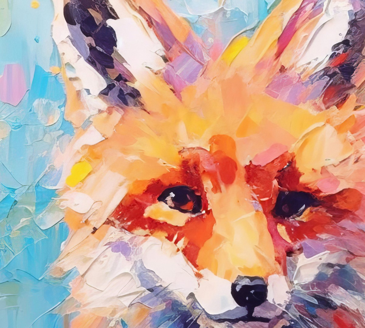 At the center of the painting, the fox gazes directly at the viewer with piercing eyes, contrasting beautifully against the swirling colors. Furthermore, the texture of the paint adds an expressive, dynamic effect, as if the fox is emerging from the canvas. The background, a vivid mix of blues, pinks, and yellows, enhances the playful energy of the composition.