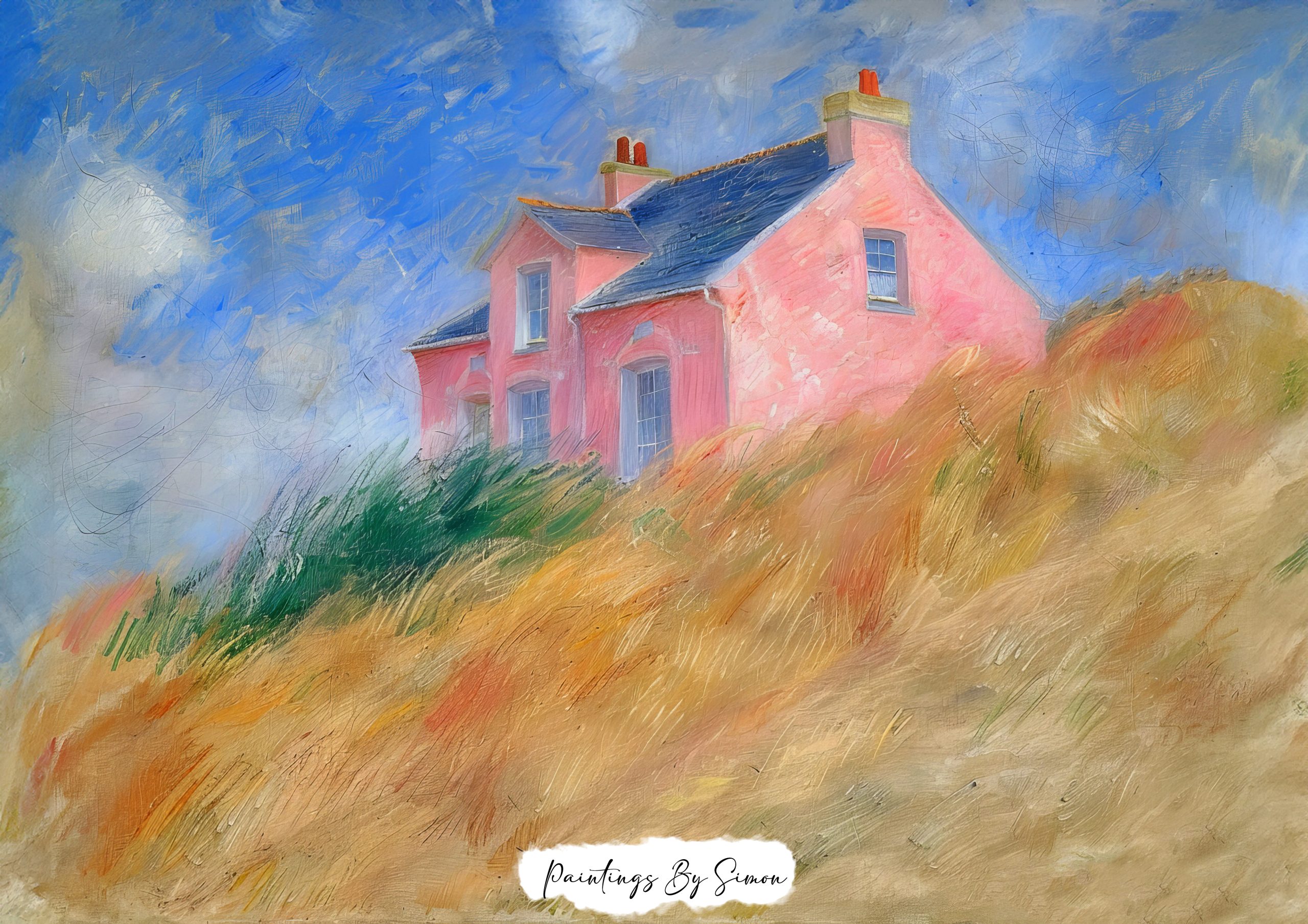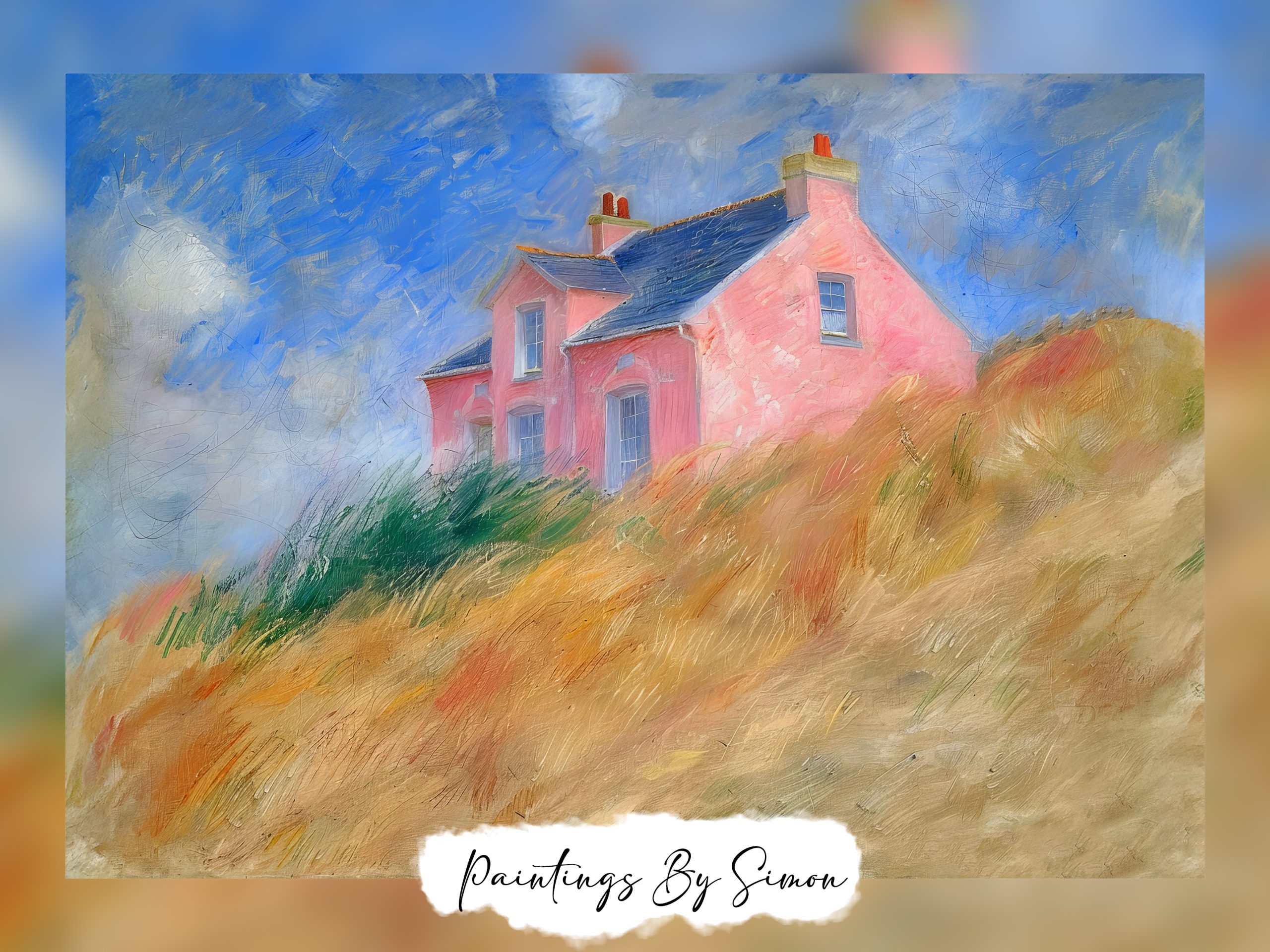 This enchanting painting showcases the serene beauty of a pink house perched atop a windy hillside. With soft, sweeping brushstrokes, it conveys a sense of movement, as if the grasses and trees sway gently. As a result, the scene feels alive, capturing the essence of a breezy day.