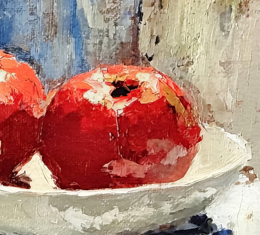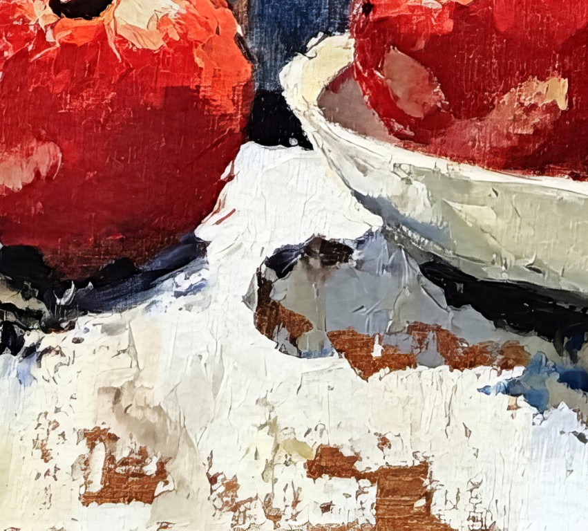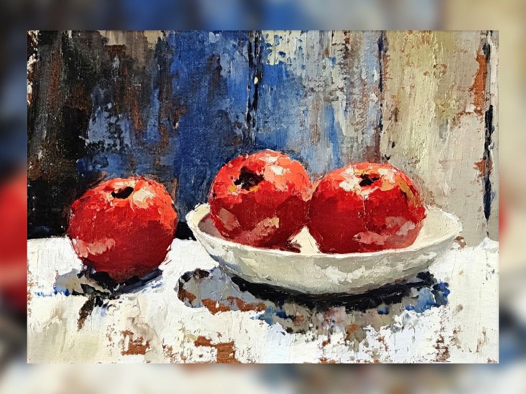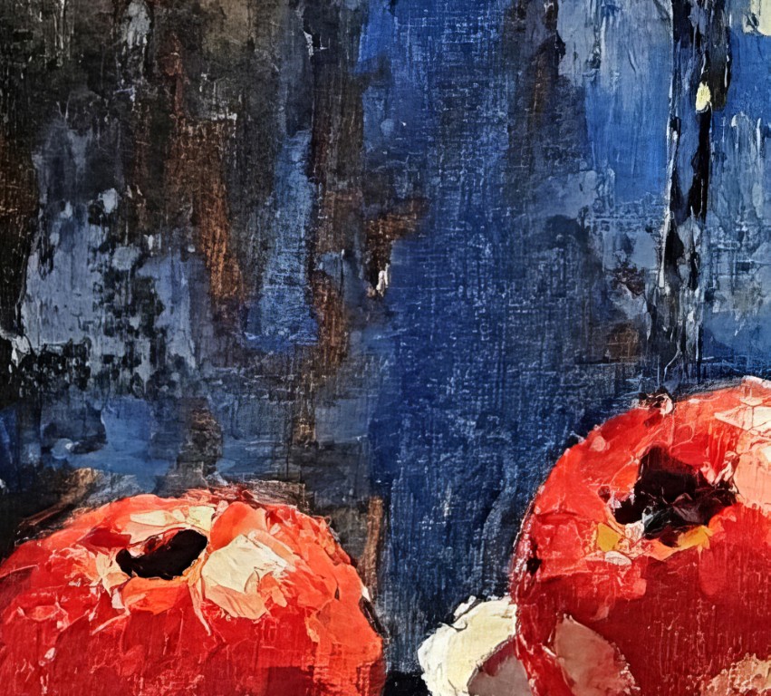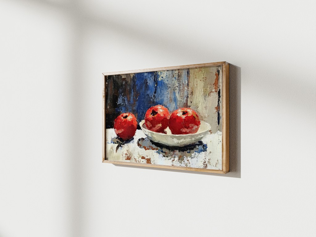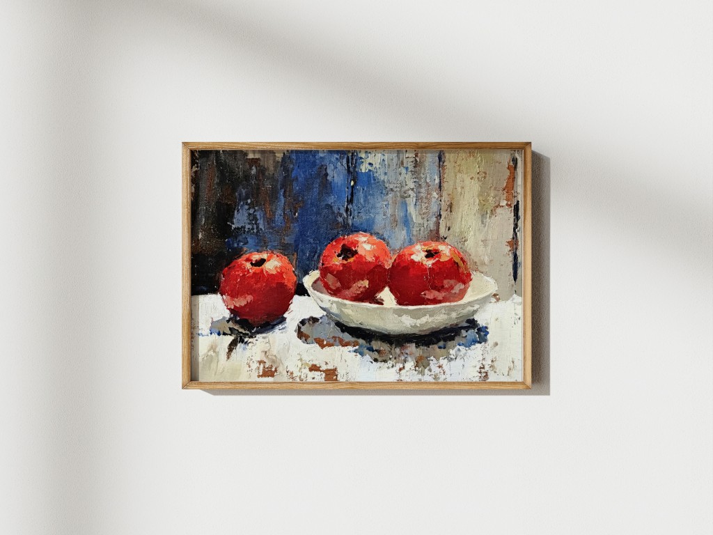 This rustic still life painting captures the raw beauty of everyday objects with expressive brushstrokes and rich texture. The deep red pomegranates, set against a weathered wooden backdrop, create a striking contrast that enhances the visual depth. The rustic charm of the background adds character, making the artwork feel warm and inviting.