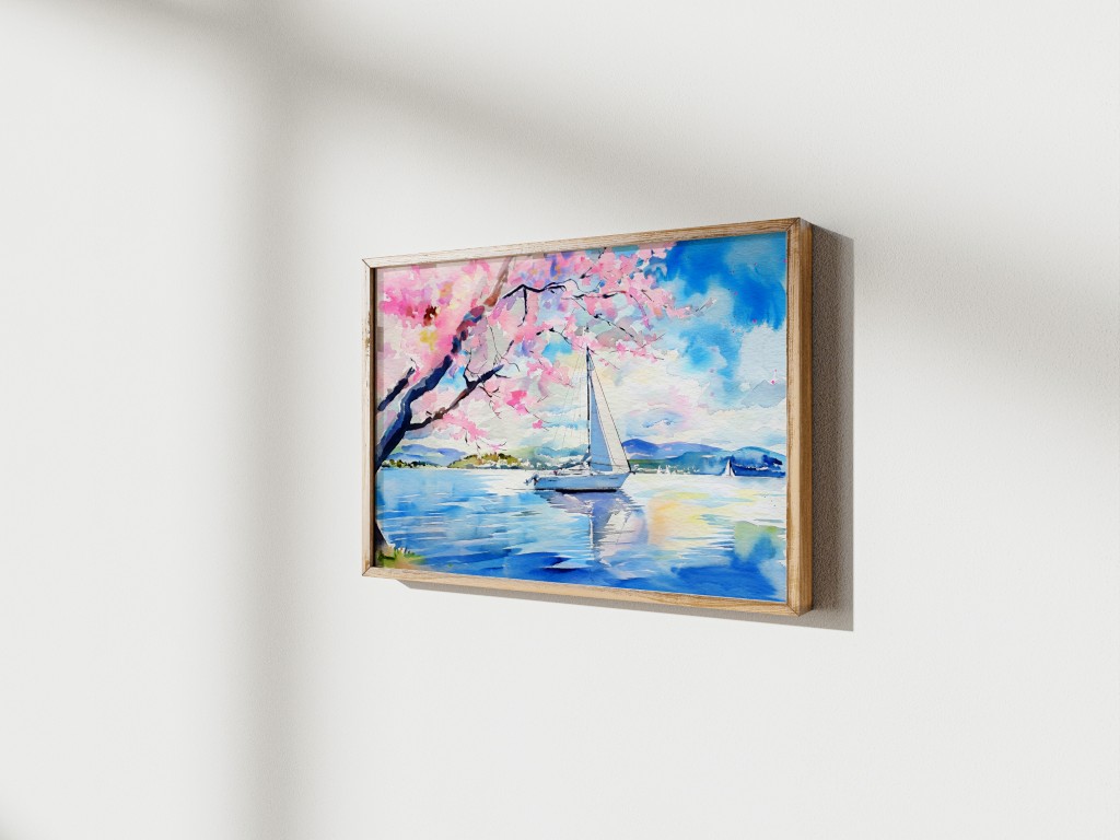This stunning Sailboat Serenity watercolor painting brings a sense of calm and relaxation. In this tranquil composition, a graceful sailboat glides across a serene lake, framed by delicate cherry blossoms in full bloom. Meanwhile, gentle ripples in the water reflect the bright sky, thereby enhancing the dreamy atmosphere.