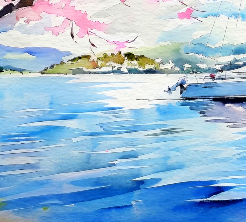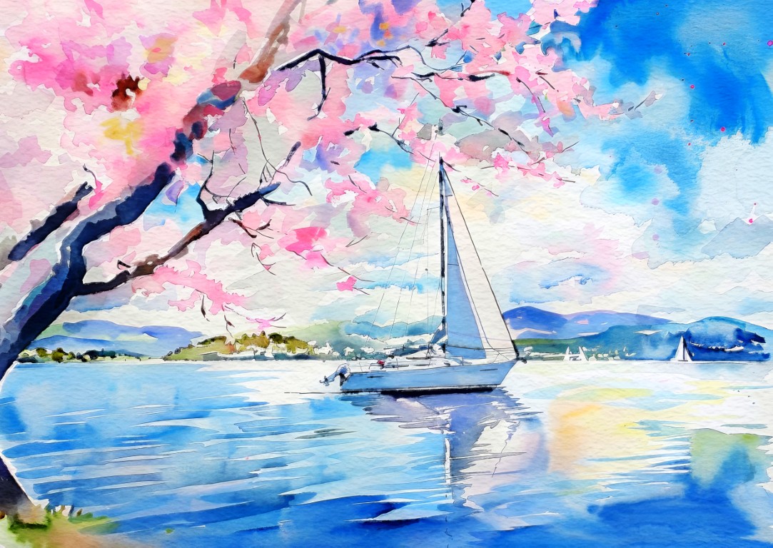 A breathtaking sailboat serenity scene captured in soft watercolor, featuring cherry blossoms, a peaceful lake, and distant mountains.