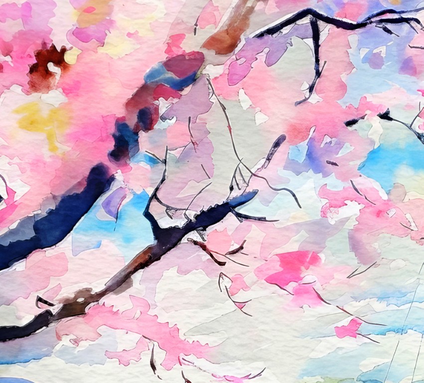 Furthermore, the artist’s soft brushwork and fluid color transitions create a peaceful ambiance, inviting viewers to immerse themselves in the scene. At the same time, the vibrant blues of the lake and sky contrast beautifully with the pink blossoms, making this painting a delightful celebration of nature’s harmony.
