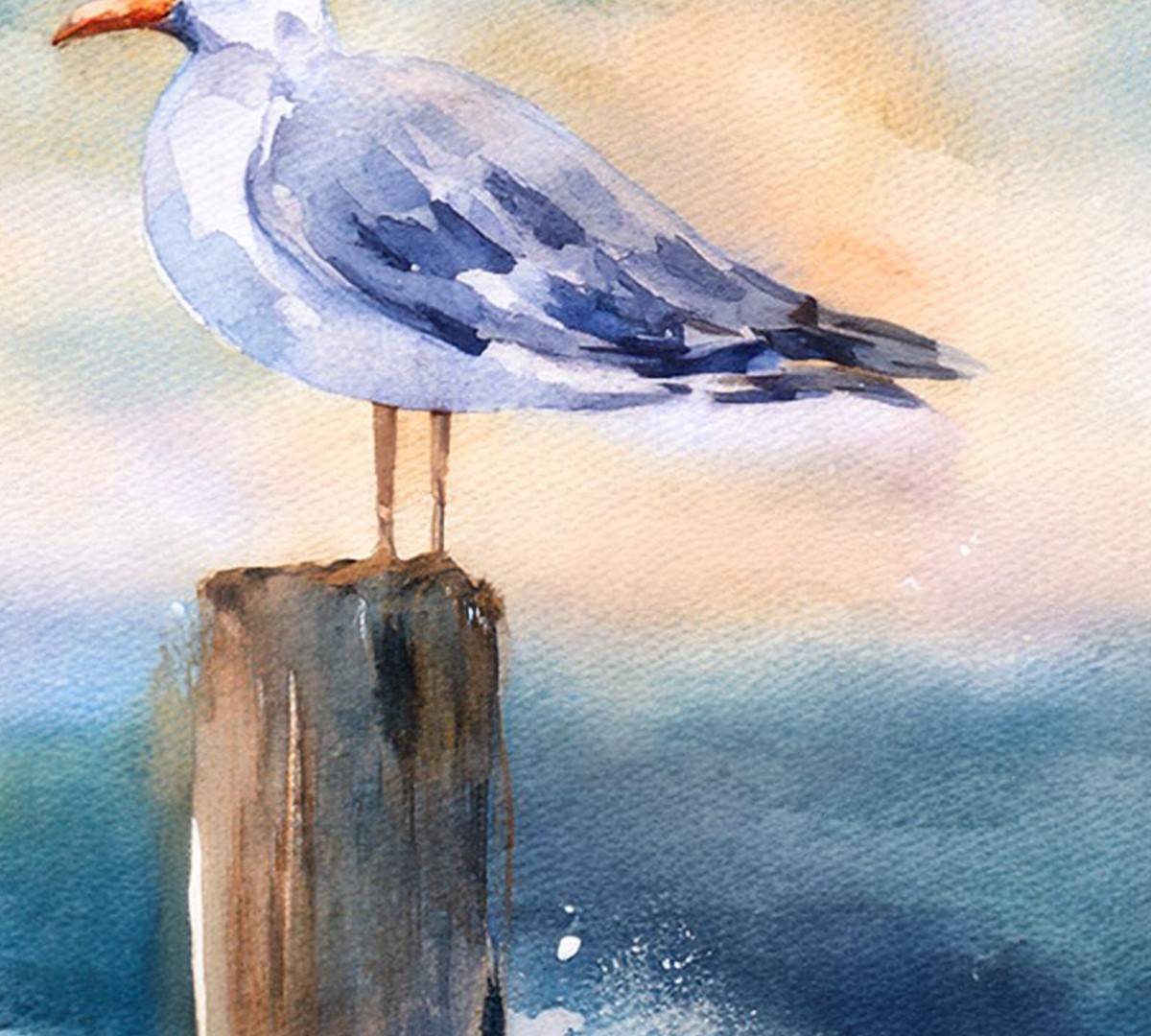 Key Features of Tranquil Seagull Overlooking the Ocean in Watercolor: