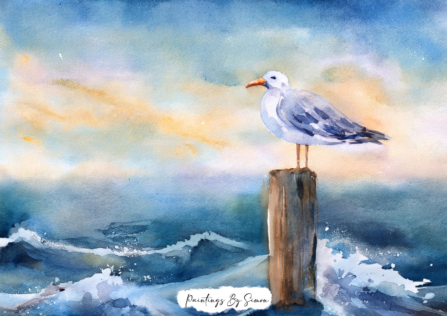 The Tranquil Seagull Overlooking the Ocean in Watercolor painting beautifully captures the peaceful essence of a seaside scene. The artist uses soft, flowing brushstrokes to create a serene image of a seagull perched on a wooden post. Additionally, the calm ocean and rolling waves are depicted with light, airy strokes, enhancing the tranquil feel of the painting.