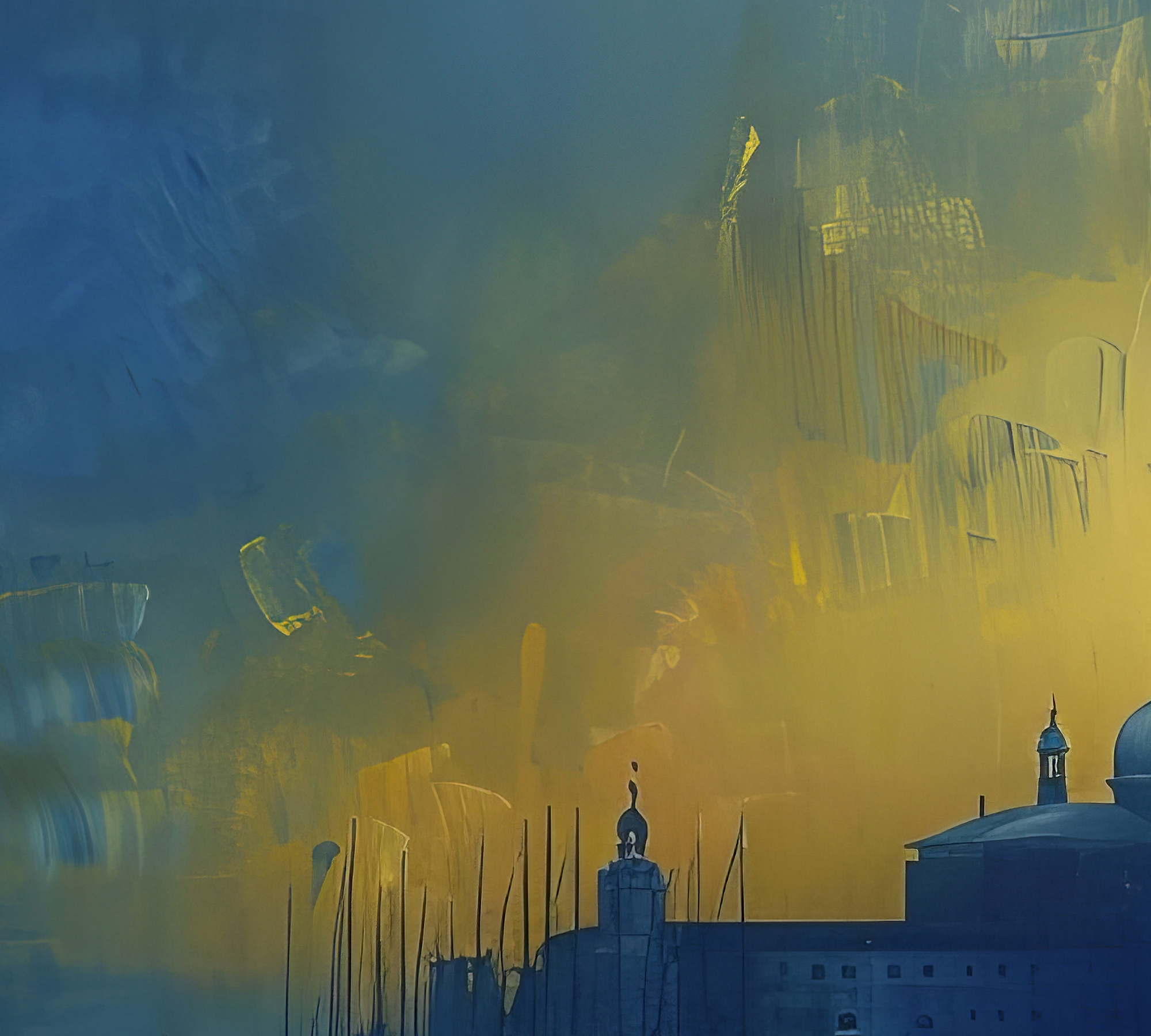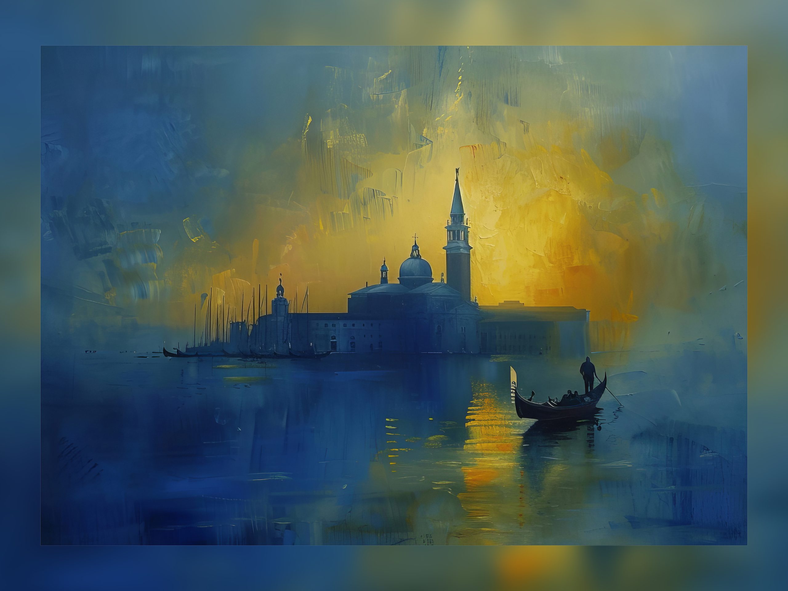Step into serenity with ‘Serene Seascape.’ This artwork invites you to pause and immerse in its tranquil blues and golden hues. A calm sea mirrors the sky as dawn breaks, painting the horizon with promise. In the foreground, a solitary gondola glides, a silhouette against the awakening day.
