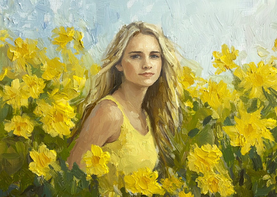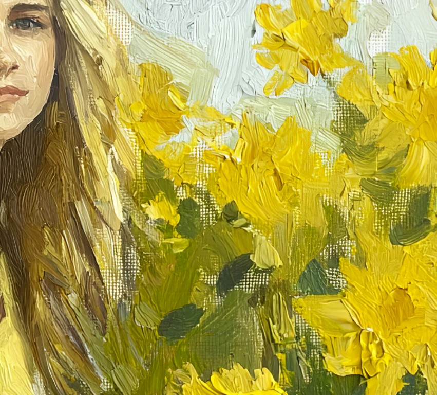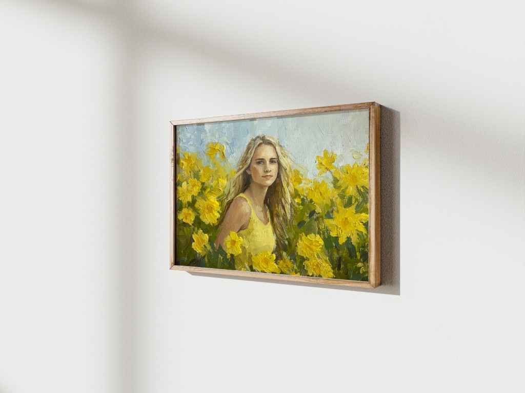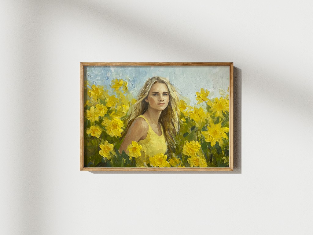 This sunflower field portrait is a breathtaking celebration of nature and femininity. The painting features a young woman bathed in golden sunlight, surrounded by vibrant yellow blooms. Her flowing blonde hair and soft expression evoke a sense of tranquility, while the lush sunflowers create a warm and inviting atmosphere.