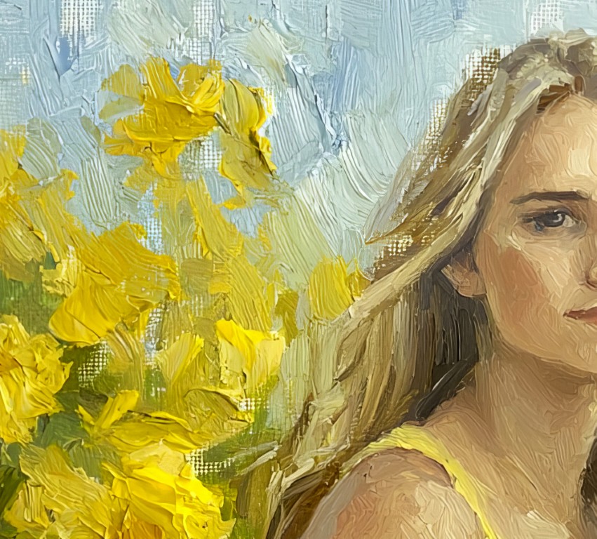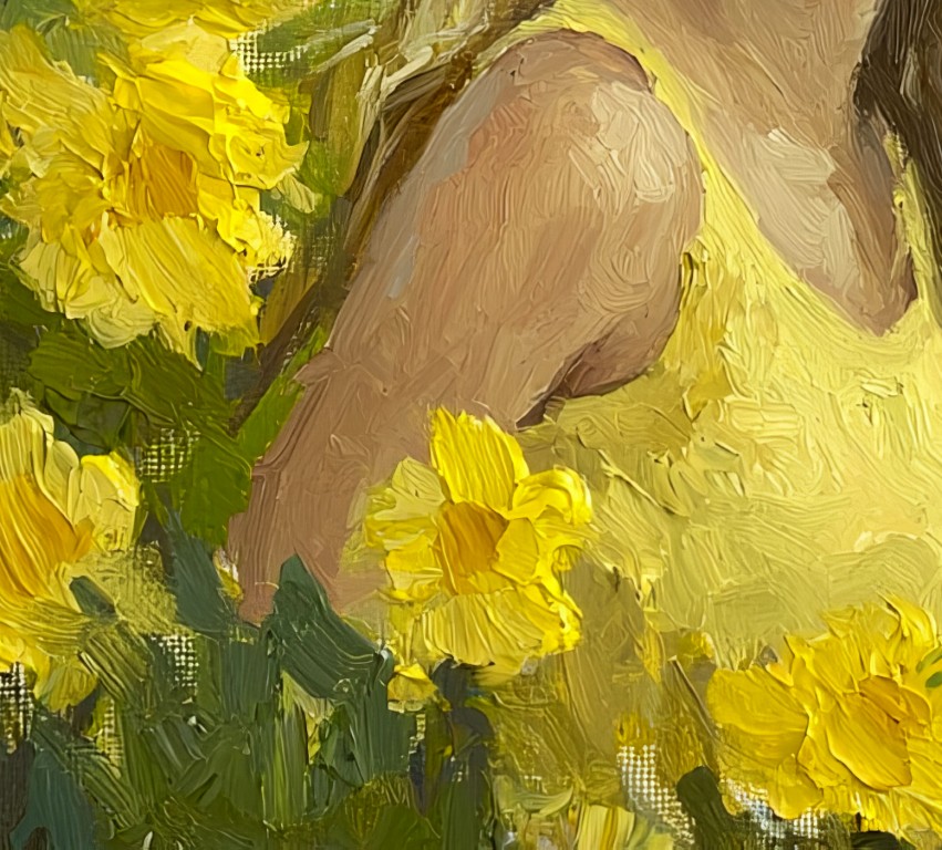 The artist’s use of thick oil brushstrokes gives the piece a rich texture, enhancing the depth and movement of the composition. The golden tones of the flowers contrast beautifully with the delicate hues of the woman’s skin and the soft blue sky in the background. The brushwork captures the energy of a breezy summer day, making this painting feel alive.