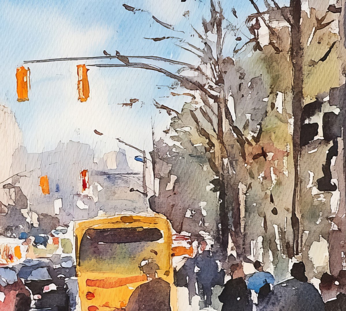 - Dynamic City Life: Vibrant depiction of cars, buses, and pedestrians