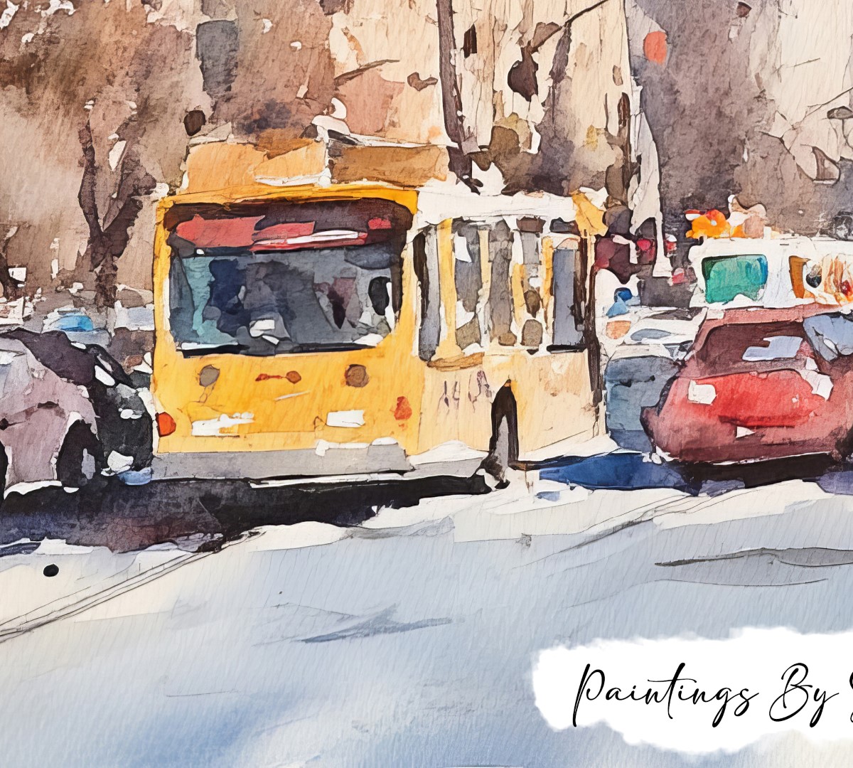 This captivating matte print, titled Urban Street Scene, brings the lively rhythm of city life directly into your space. The artwork captures a bustling urban street, filled with vibrant colors of cars, buses, and pedestrians moving through the cityscape. Furthermore, the watercolor technique adds a soft, fluid quality, balancing the city’s dynamic energy with a sense of artistic calm. Additionally, bright skies and subtle architectural details in the background create depth. The movement of people and traffic embodies the spirit of modern urban living, making the scene feel alive.
