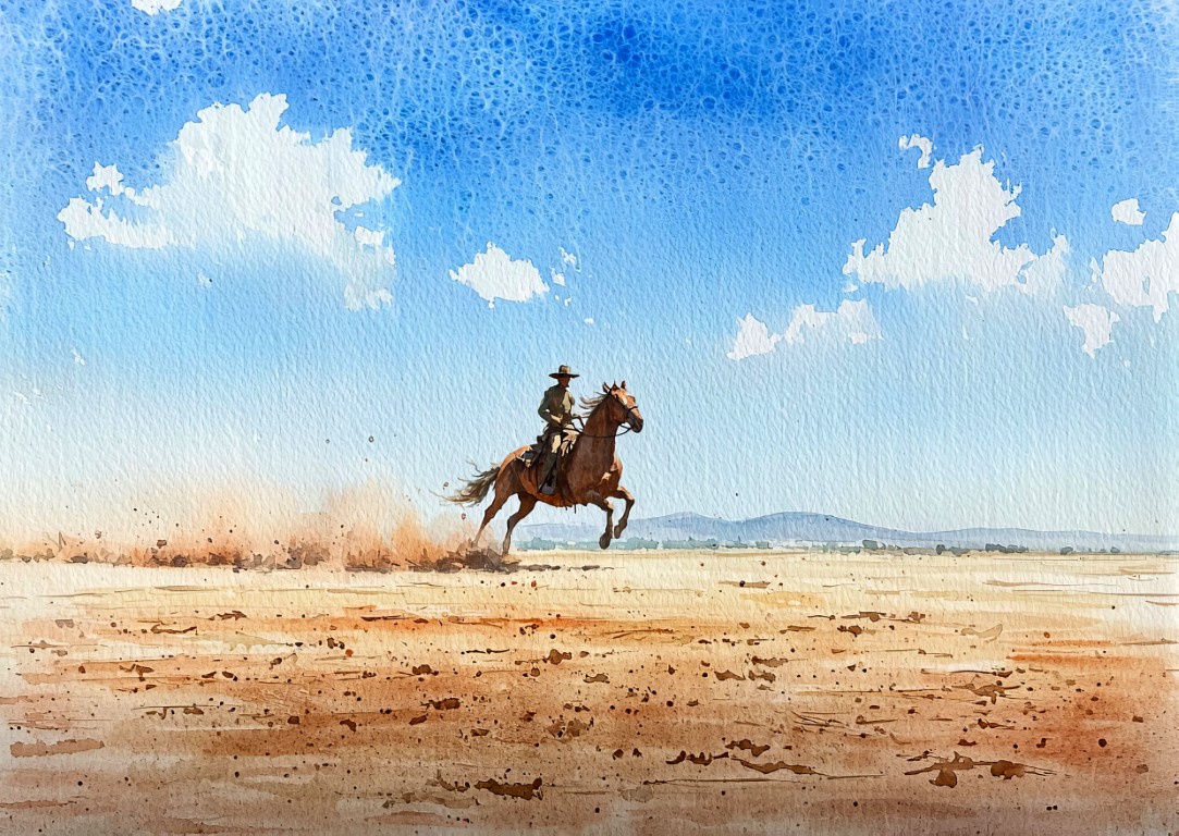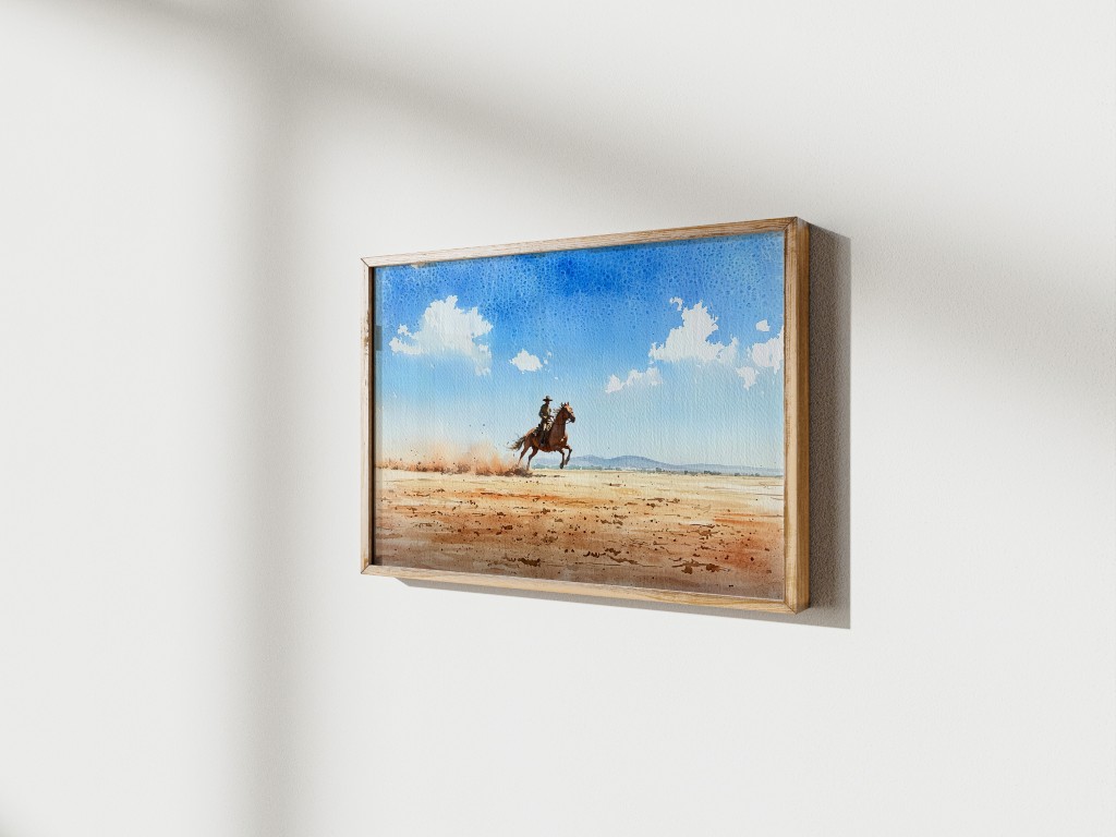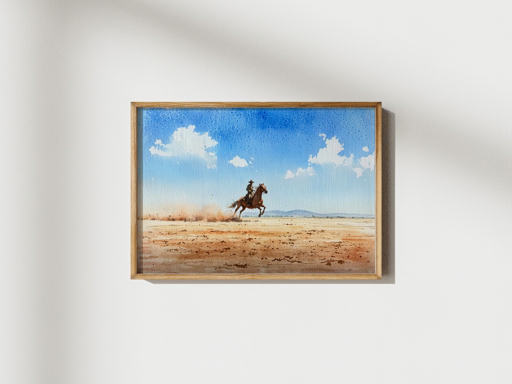 This Western cowboy watercolor masterfully captures the spirit of the frontier with a lone cowboy riding his horse at full gallop across an expansive desert landscape. The soft watercolor strokes blend seamlessly, creating a sense of movement and adventure. The sky is vast and bright, filled with delicate cloud formations, while dust rises from the horse’s powerful strides, enhancing the artwork’s dynamic energy.