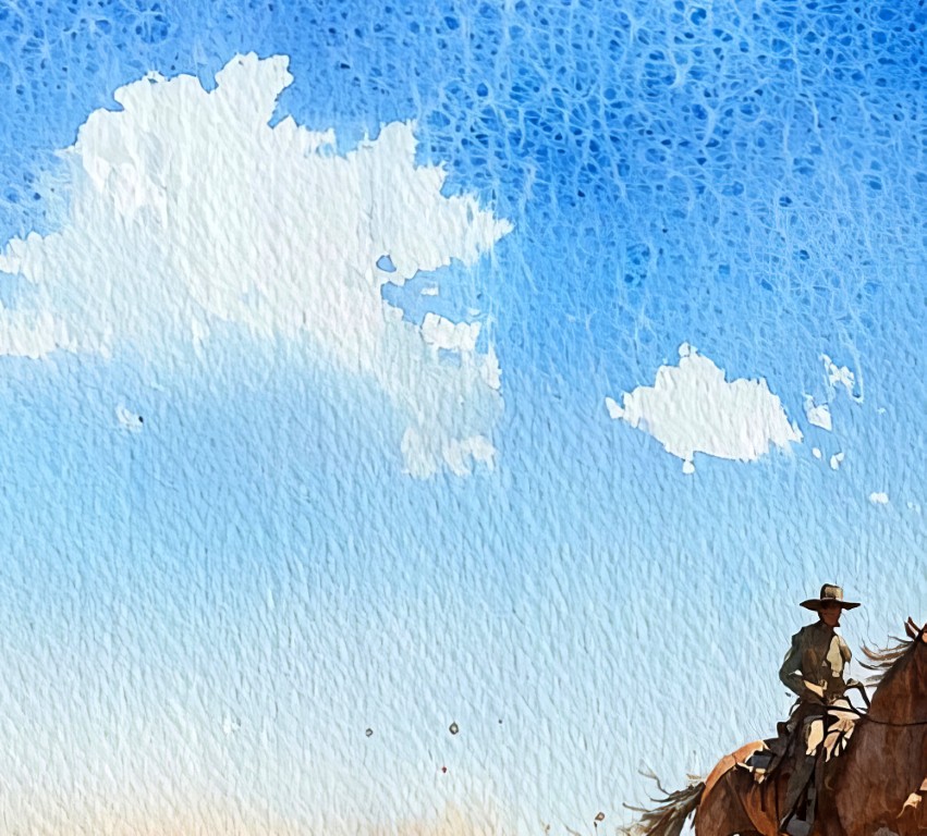 - Beautifully detailed cowboy and horse in fluid watercolor strokes
