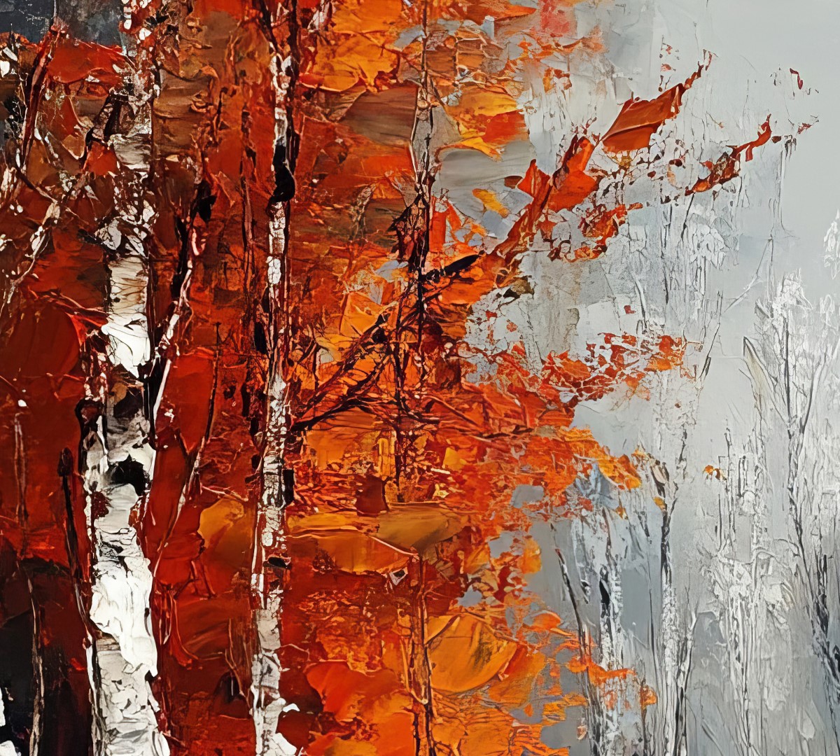 Moreover, the artist uses thick brushstrokes to add texture and depth, especially in the trees and snow-covered landscape. The painting blends the crisp chill of winter with the lingering warmth of fall, merging both seasons into one harmonious image. Furthermore, the detailed texture of the bark and leaves contrasts with the smooth snow, adding dimension to the scene.