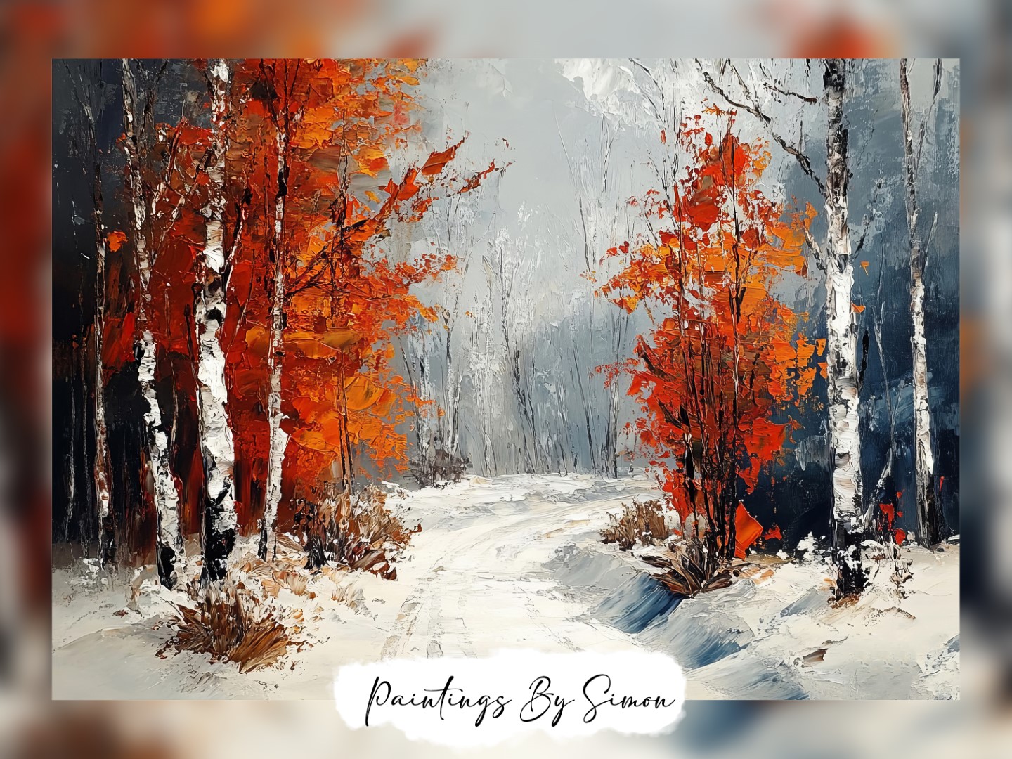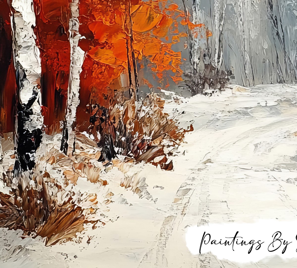 As you look closer, the painting invites you to walk along the pathway, immersing yourself in the snowy forest’s quiet stillness. The rich contrast between the cool, gray background and warm autumn hues creates a magical, almost ethereal quality. This artwork is ideal for any space, bringing a calming yet invigorating atmosphere.